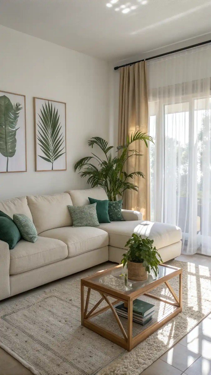 From what I've observed, embracing a harmonious blend of muted tones and natural elements creates a truly inviting space. This image perfectly illustrates how incorporating beige sofa living room ideas with green accents can establish a fresh, yet timeless, aesthetic that resonates with serenity.