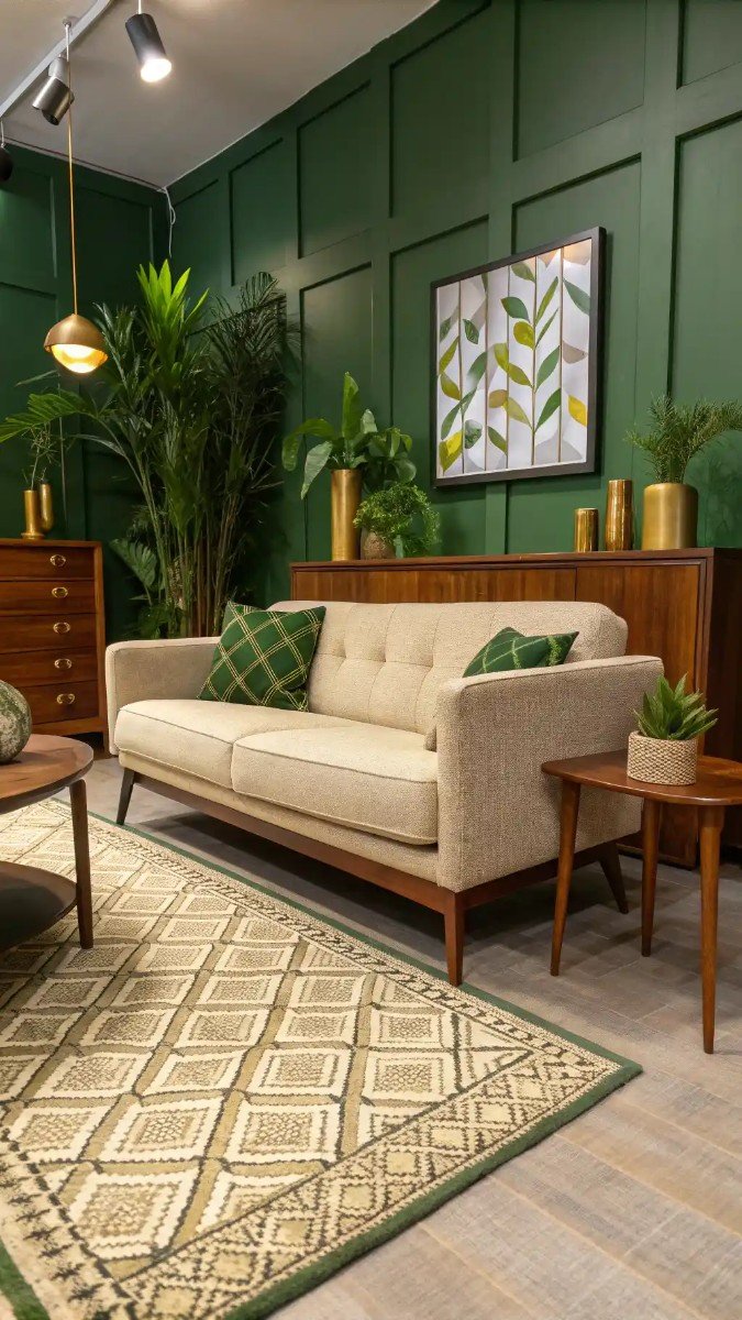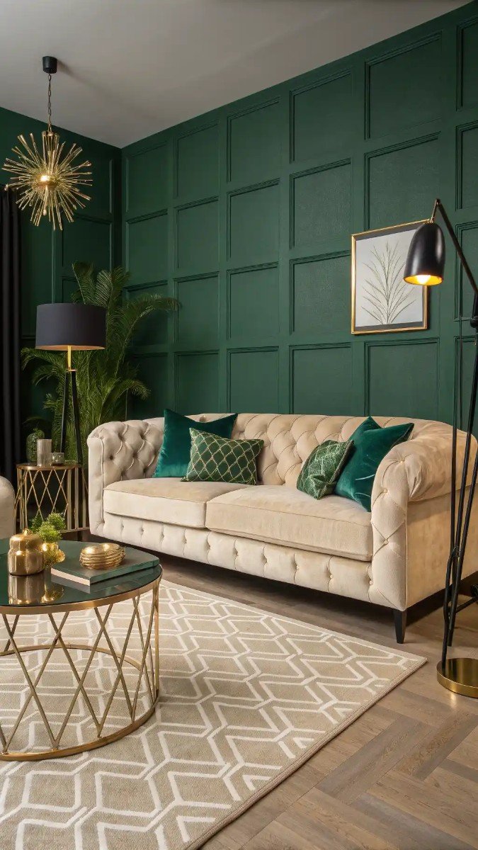 One thing I've learned is that a sophisticated color palette creates an immediate sense of luxury. This image perfectly illustrates how to achieve a harmonious and elegant space using specific design choices. The combination of a beige sofa with a deep green paneled wall is particularly striking and inviting.