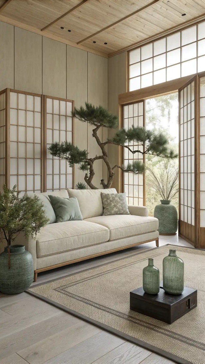 Notice how the neutral beige sofa acts as an anchor, allowing the varied shades of green from the planters, cushions, and decorative elements to truly pop. This thoughtful layering of greens introduces vitality without overwhelming the calm ambiance. The traditional Japanese screens further enhance this serene atmosphere, making it an excellent blueprint for beige sofa living room ideas with green.