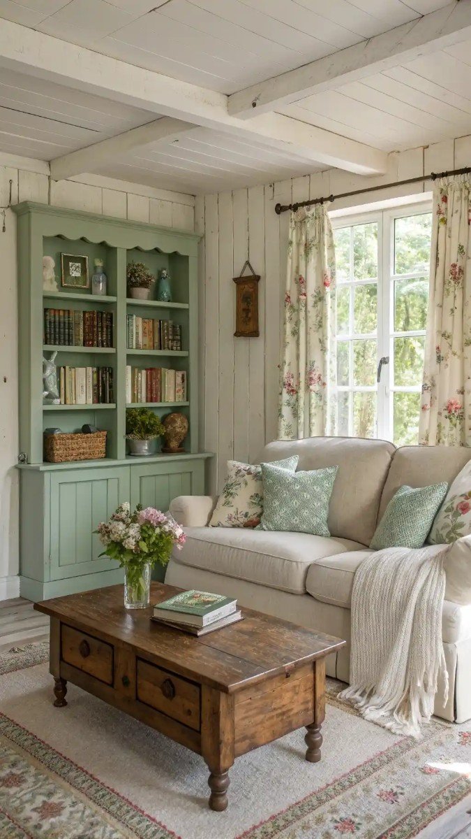 I find that pairing a plush beige sofa with a prominent sage green bookshelf and coordinating throw pillows instantly elevates the room. The floral curtains and fresh flowers on the coffee table add a delightful layer of pattern and life, providing a cohesive and thoughtful design strategy. For those exploring beige sofa living room ideas with green, I recommend using various shades of green to add depth and visual interest without overwhelming the neutral base.