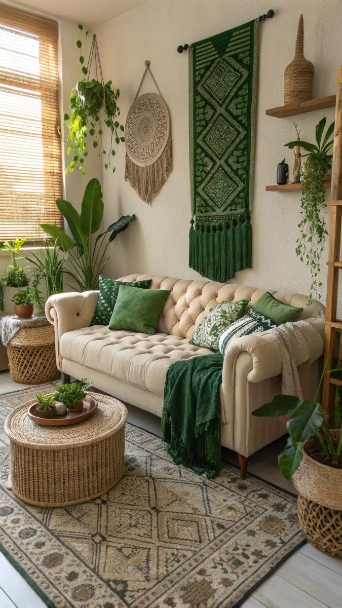 Notice how the varying shades of green, from the lush plants to the patterned throw pillows and even the striking wall tapestry, create depth and visual interest. This strategic use of color elevates the space, making the beige sofa feel less stark and more integrated. It’s a testament to how thoughtfully chosen accents can transform a room, and for me, these beige sofa living room ideas with green are truly inspiring.