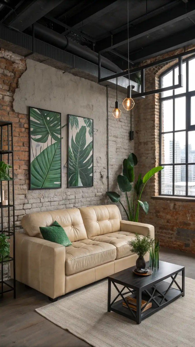 Ultimately, a well-executed \”beige sofa living room ideas with green\” concept not only brightens a room but also injects vitality, proving that even in a rugged industrial space, natural harmony is achievable and impactful.