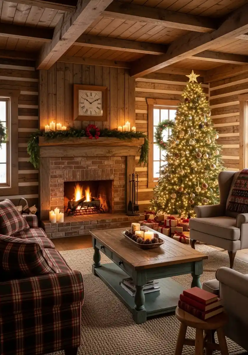 cottage christmas decor: Log-cabin magic with plaid, pine, and a friendly fire