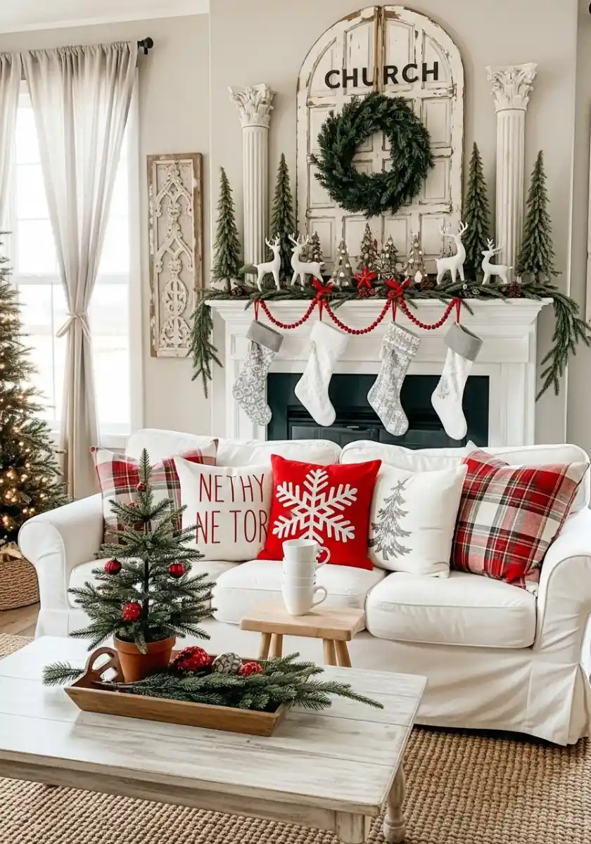 I adore this cottage-style Christmas decor because it feels cheerful without trying too hard. The white slipcovered sofa is basically a snowbank for red and plaid pillows. Notice the mantel: tall miniature trees, simple reindeer, and a beaded red garland. It creates up-and-down movement so the eye keeps traveling. That’s why the whole space reads fuller and more “finished.”