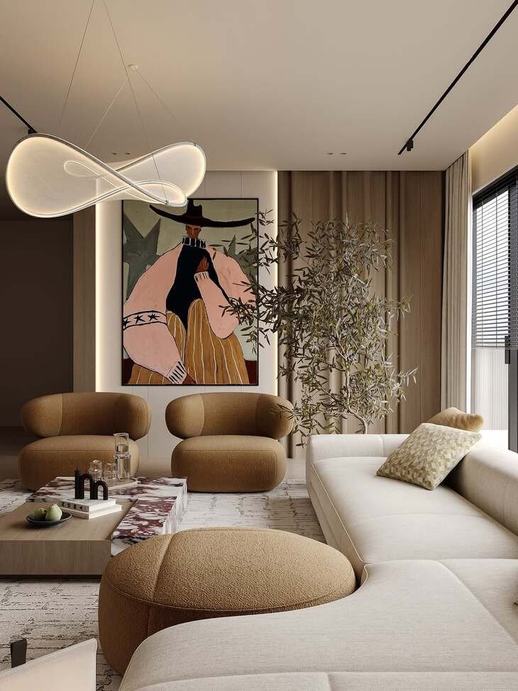 One of the simplest tricks to make your apartment’s living room feel more inviting? Maximize natural light! I don’t care what kind of design you're into, a room bathed in natural light automatically feels more welcoming. This living room design uses a lot of warm neutral tones—like beige, wood, and soft whites—that perfectly complement the sunlight pouring in from large windows. It's a cozy, airy vibe that just invites you to sink into that comfy couch and relax.
