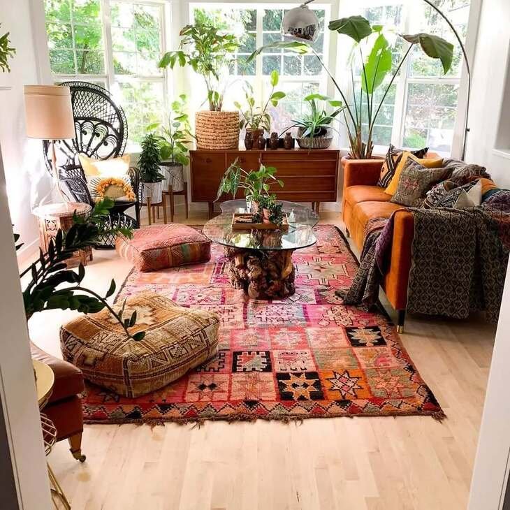 Bohemian or boho design is all about mixing colors, textures, and patterns to create a warm, relaxed living room that feels uniquely yours. In this living room, the combination of rich fabrics, colorful throws, and mismatched furniture creates an eclectic vibe that feels personal and inviting. The key to pulling off boho decor is embracing imperfection—mixing patterns and textures in a way that feels organic and free-spirited.