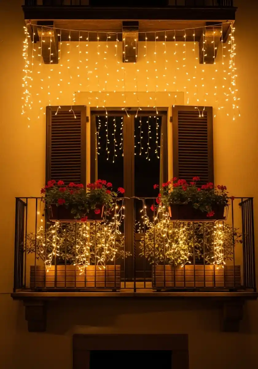 Warm icicle lights that drip from the eaves and sweep across shutters are the fastest way to set a golden, fairy-tale mood. On a small balcony, the soft glow makes everything feel bigger and more welcoming. Wrap window boxes with the same mini lights, then let a few strands trail down the iron railing and around planters. The repeat of warm light at three heights keeps the eye moving and hides clutter. Red geraniums pop even at night, which I love because they’re low effort.