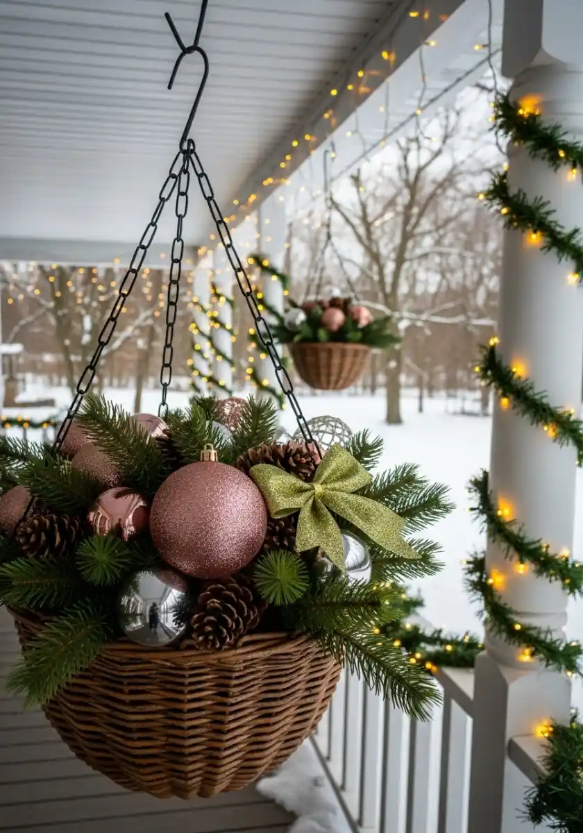 A porch-style balcony looks sweet with hanging wicker baskets stuffed with evergreens, pinecones, and blush-pink ornaments. Tie each with a soft green bow for a gentle contrast. Spiral columns or posts with lit garland to frame the scene.