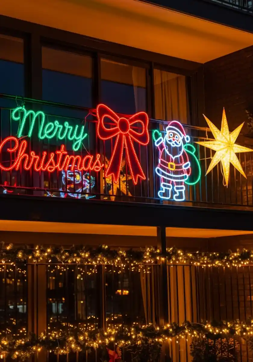 Sometimes you just want to shout Merry Christmas. Mount neon-style silhouettes spelling the phrase with a glowing bow, Santa, and a star. Pair it with a classic garland of warm lights along the rail so it doesn’t feel random.