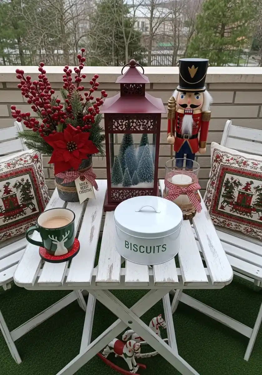 Turn a petite bistro set into a tiny cocoa bar. Add a red lantern with a mini bottle-brush forest inside, a poinsettia and berry arrangement, and a standing nutcracker for personality. Patterned holiday pillows soften the seats, and a steaming mug makes it legit.