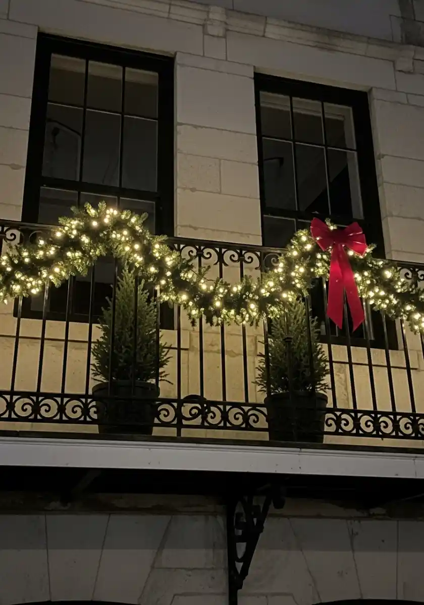 This is restrained and timeless balcony christmas decor. It pairs nicely with historic buildings where too much bling looks out of place. Keep the bulbs warm white and you’re done in under an hour.
