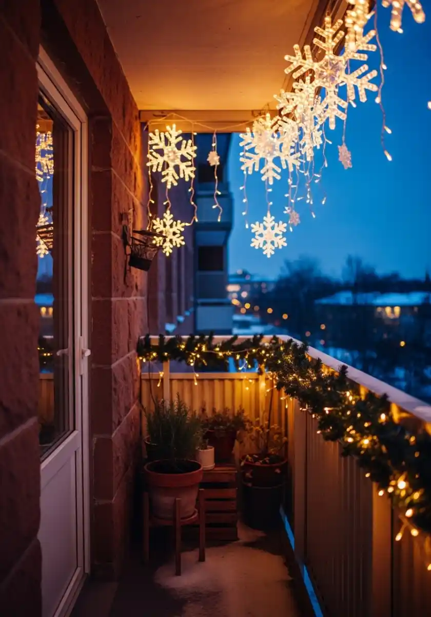 A slim city balcony can still feel enchanted. Hang warm icicle lights shaped like snowflakes from the ceiling at staggered drops. Wrap a thick evergreen garland around the railing and lace it with golden fairy lights. The mix of vertical and horizontal light gives depth.