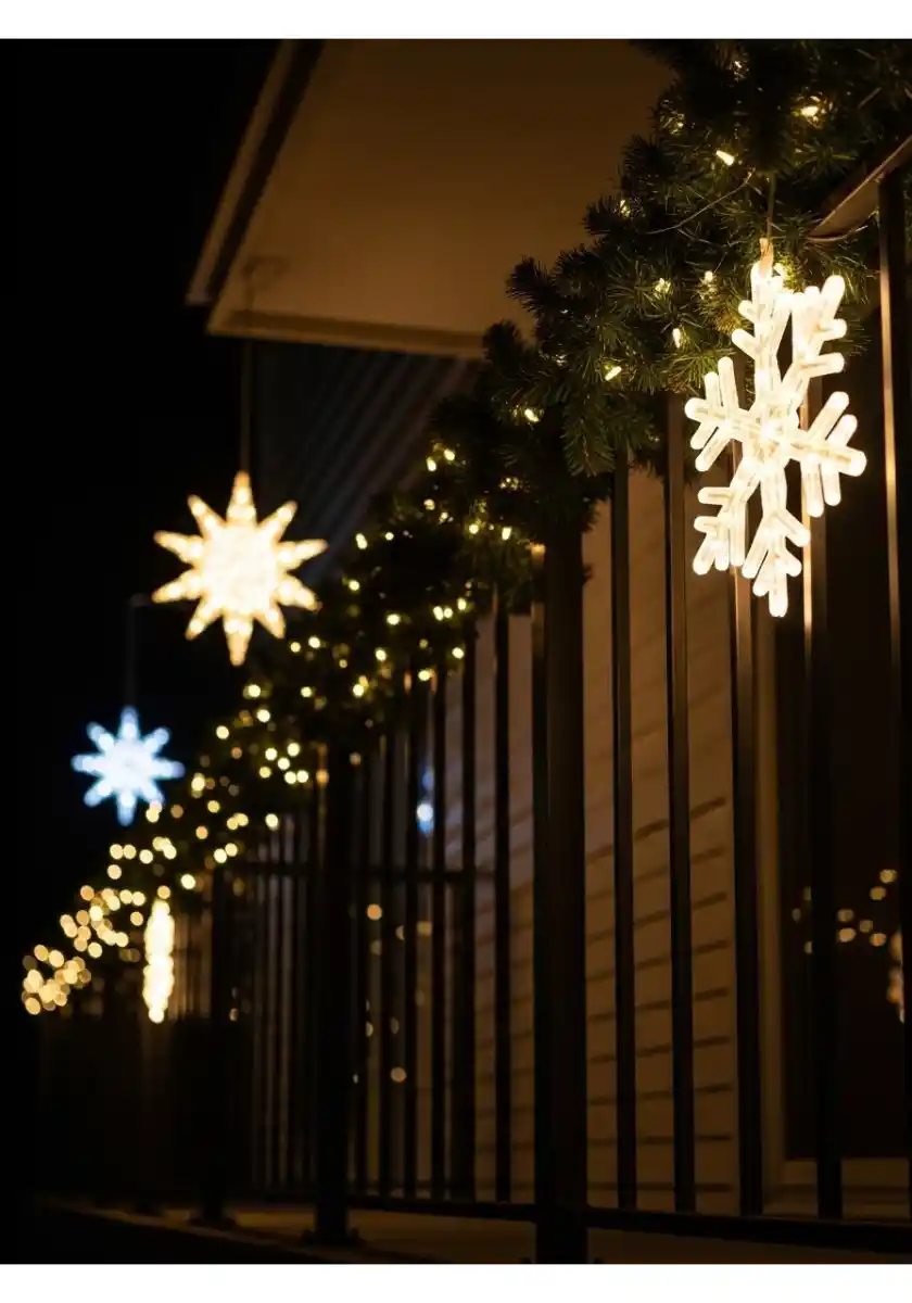 Modern metal rails love clean shapes. Thread a thick evergreen garland along the top rail and add micro lights for a soft outline. From that top line, hang acrylic snowflakes and star pendants at even intervals. The repetition feels crisp and wintry, like patterned wrapping paper.