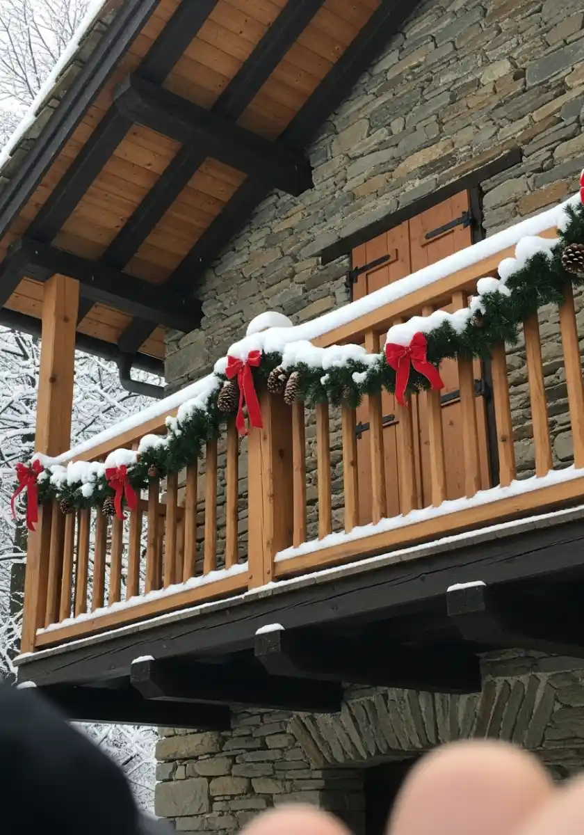 If you want “mountain postcard,” go rustic chalet. A timber balcony capped with real snow is practically a gift, but even without snow a simple garland, red velvet bows, and chunky pinecones deliver. The palette stays classic and easy to maintain, which is great if you’re busy.