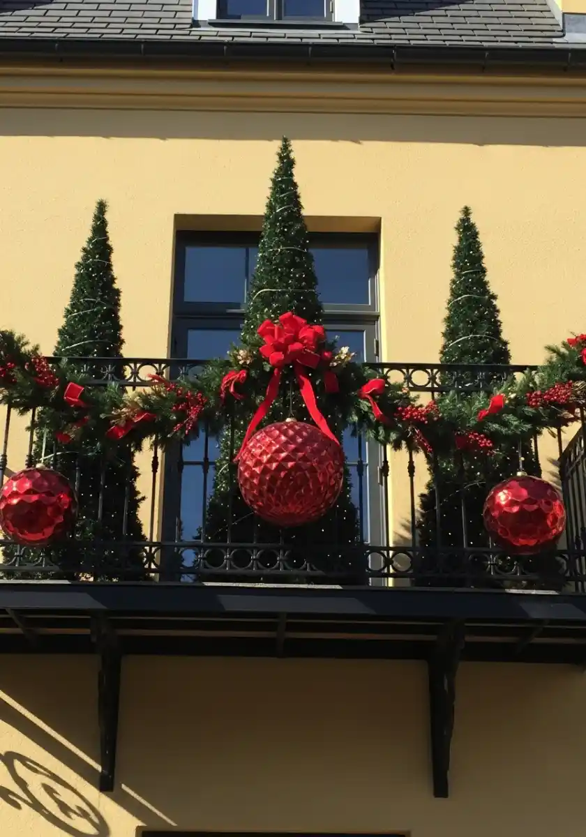 I like to stake the topiaries into weighted pots so winter winds don’t tip them. This Christmas balcony décor is polished and easy to refresh next year, just swap bow color or the bauble finish.