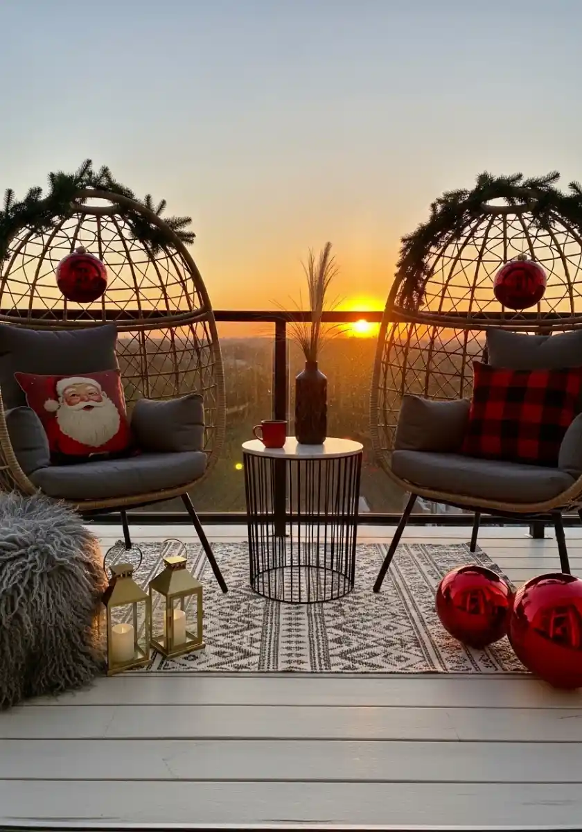 For hanging out, build a sunset balcony lounge. Two woven egg chairs topped with mini garlands and red ornaments feel playful and comfy. A patterned rug grounds the seating and hides chilly flooring. Add a Santa pillow, a buffalo-check pillow, and two gold lanterns with LED candles. Place giant glossy baubles on the floor like playful sculptures.