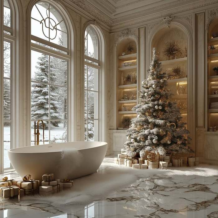 This last space is dramatic. Tall arched windows, glossy marble floors, and a full-size tree with gold ornaments right next to the soaking tub. It could feel too much, except the palette stays cream, gold, and soft white. Presents wrapped in neutral paper echo the veins in the floor and the built-in shelves glow like candlelight. If you’ve got the room, a real tree in the bathroom is next-level bathroom christmas decor and I’m not sorry about loving it.