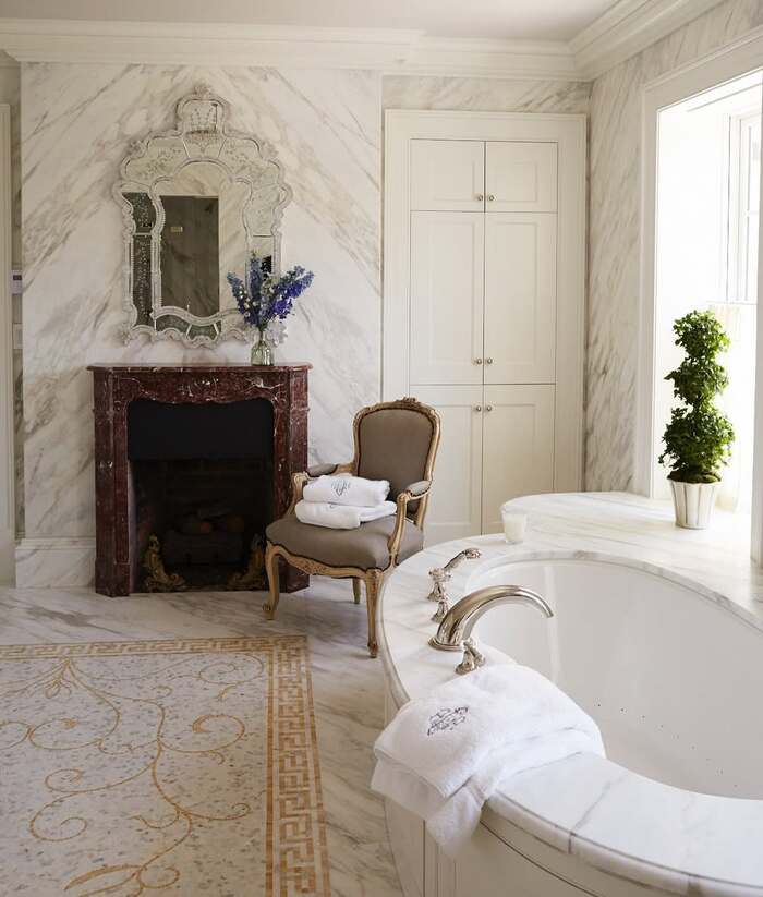 Second part is warmth. Marble can feel cold, so I borrow a trick from this room. Bring in a soft rug with a glint of gold thread, or a bath mat with a Greek key border. It reads fancy even if it’s not. Use warm light bulbs at the vanity and a single cinnamon candle by the tub. Hack I swear by: place a battery tea light inside the empty fireplace if you don’t have a real fire. The flicker bounces off the marble and makes the whole space feel rich. This is Christmas bathroom decor that whispers, not shouts.