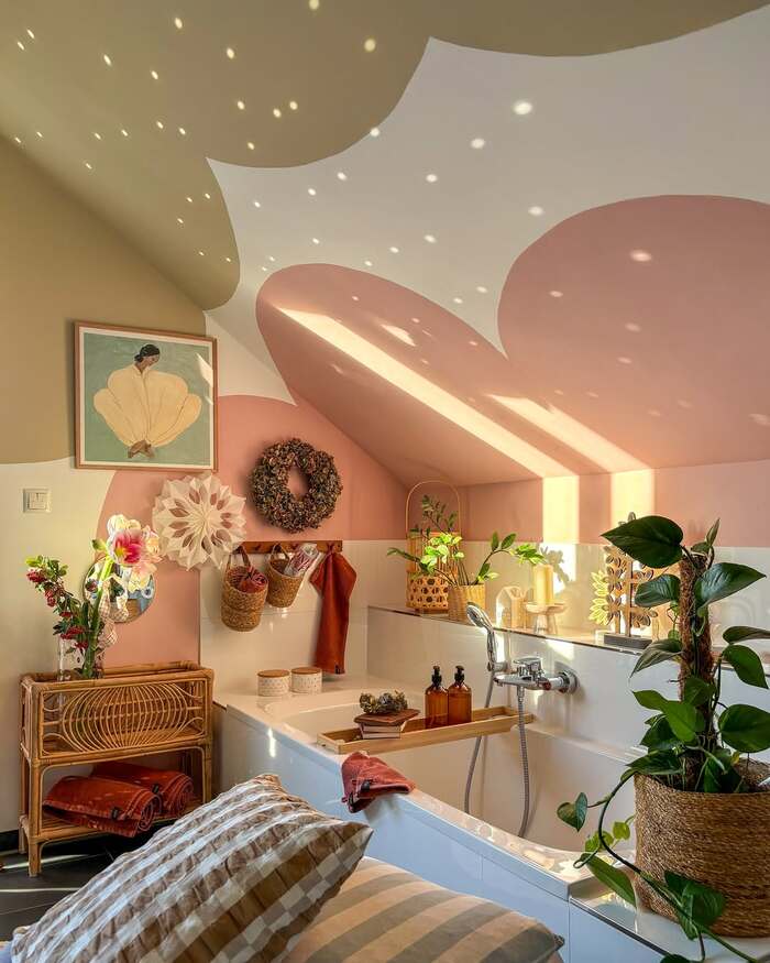 Then there’s the cheerful attic bath with the scalloped ceiling. It’s peachy pink and beige with sunlight throwing little star dots everywhere. This is holiday bathroom decor for people who like whimsy. Paint a big scallop or cloud shape above the tub. If painting is not happening, stick removable wall decals in soft shapes along the ceiling line. Add rattan baskets for washcloths and a small wicker shelf for extra soaps. The floating paper flowers and a mini wreath over the tub give movement without getting soggy. I hang hand towels in rust and blush because they feel like cozy sweaters.