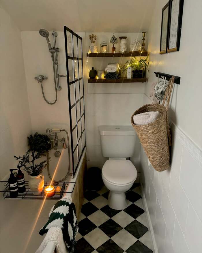 Small bathroom crew, I see you. This narrow bath stacks everything along one wall, yet it still feels relaxing and kinda romantic. The black grid shower screen gives structure like a windowpane, which is very high-end for not much money. To recreate, stick peel-and-stick grid decals on a clear shower curtain or upgrade to a framed panel if your landlord is cool. Keep the palette black, white, and wood so the space doesn’t feel busy. A checkered floor mat echoes the tile and adds a dash of drama.