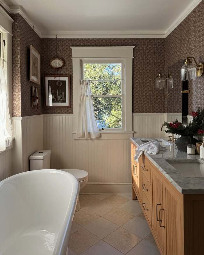 Old-house lovers, this space owns my heart. There’s beadboard wainscoting, a wood vanity, and patterned wallpaper that almost looks like falling snow. If your bathroom skews classic, your holiday touches should feel collected. Start with greenery. A small vase of cedar or pine on the vanity brings freshness and a gentle forest smell. I tie a thin velvet ribbon around the vase in cranberry or hunter green. It’s simple but thoughtful. Keep soap in a stone dish and cotton rounds in a glass jar so it all looks tidy.