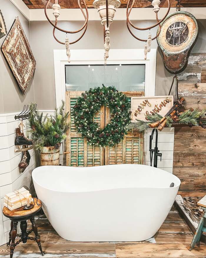 Last one is the big mood, the full holiday movie set. A freestanding tub in front of chippy shutters, a huge wreath, a wooden sign that says merry, plus a chandelier that looks like it came from a barn party. It’s bold, but still cozy because everything is earthy. To copy, start with one large statement, either a big wreath or a reclaimed shutter backdrop. If you don’t own shutters, two old doors propped safely behind the tub give the same vibe. Keep the wreath full and green, add a few pinecones, maybe a ribbon in deep red.
