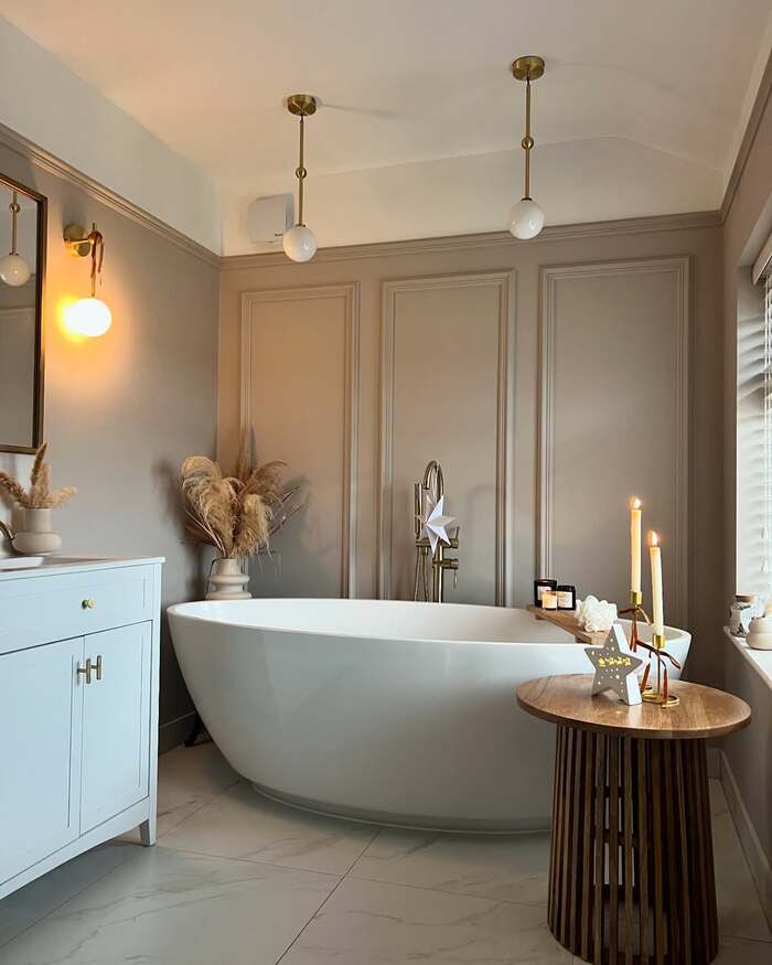 This beige and taupe sanctuary gives me winter spa vibes. Paneled walls, a sculptural tub, and pampas grass feel soft and grounded. The little paper star by the faucet is such a tiny move, but it tells the whole holiday story. I know some folks think seasonal bathroom decor needs red and green. Not true. You can go all neutral and rely on shape and glow. Two round pendants and a single wall sconce bounce warm light off the walls, and that’s half the magic.