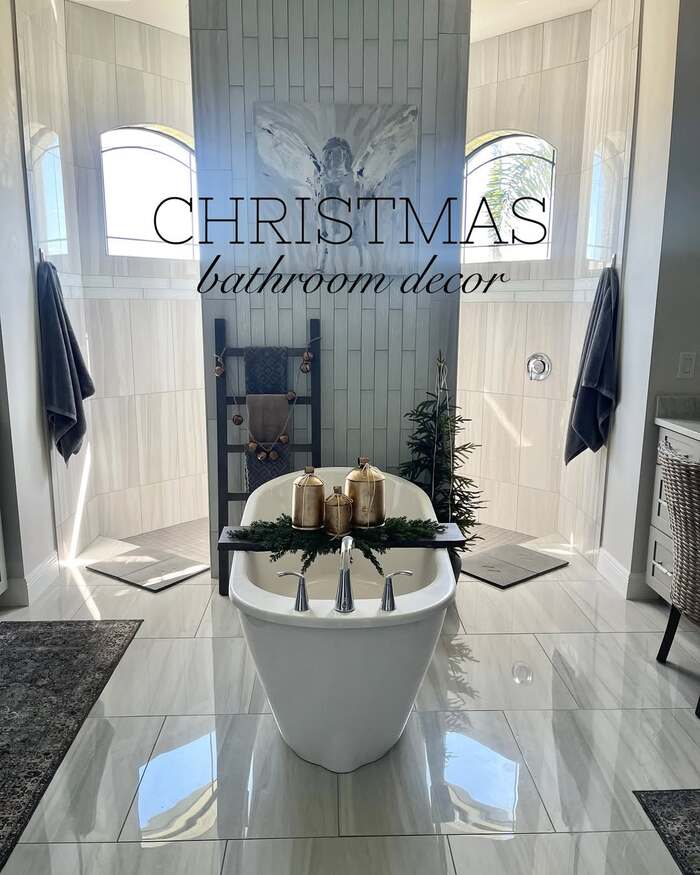 This rustic room hits me right in the feelings. The chunky wood beams make everything feel old-world cozy and that amber orange tub brings the glow. A petite Christmas tree on a stool is the hero, lit with tiny warm lights and tied with a dark ribbon. The lantern on the floor adds a soft flicker that kind of slows your breathing. I’m a sucker for textures, so the furry rug and the rough wood next to smooth tile is chef’s kiss. If you want bathroom christmas decor that feels natural, steal the stool tree idea and mix wood with wool.