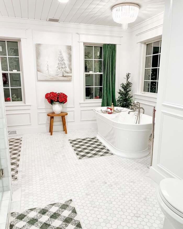 This bathroom feels like a white Christmas cookie. Paneled walls, white hex tile, and shiny fixtures make the space bright, then deep green velvet curtains and red poinsettias bring the party. I’m obsessed with the plaid mats because they add pattern without shouting. If you love traditional Christmas bathroom decor, work with textiles first. Curtains, mats, and towels set the mood faster than any ornament.