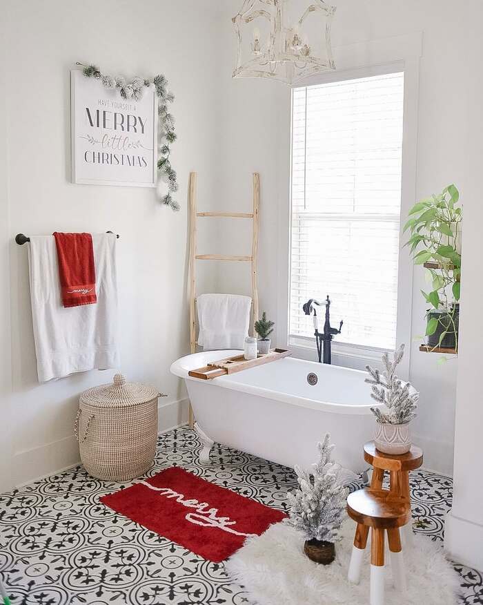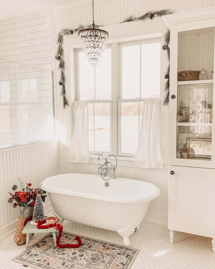 Snowy white walls and beadboard with a crystal chandelier make this bathroom feel like a gentle snow day. The garland swagged around the window is thin and airy, which I prefer to heavy ones because it keeps the sunlight. A tiny tree on a low stool, a patterned rug, and a small tray with red beads add just enough color. For airy holiday bathroom decor, keep most surfaces white and pick decor that sparkles instead of shouting.