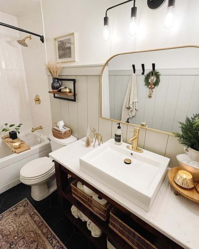 Plants are the secret mood lifter here. A pothos trailing in a woven pot, a little fern on the tub ledge, even a vase with grocery store flowers. Light dances off green leaves and makes the room feel alive. For festive bathroom decor, line the back ledge with gold taper holders and beeswax candles, but keep them away from the shower splash zone. Pro tip, clip a few eucalyptus stems in the hot shower and the whole place smells like a spa gift basket. I promise you’ll smile brushing your teeth.