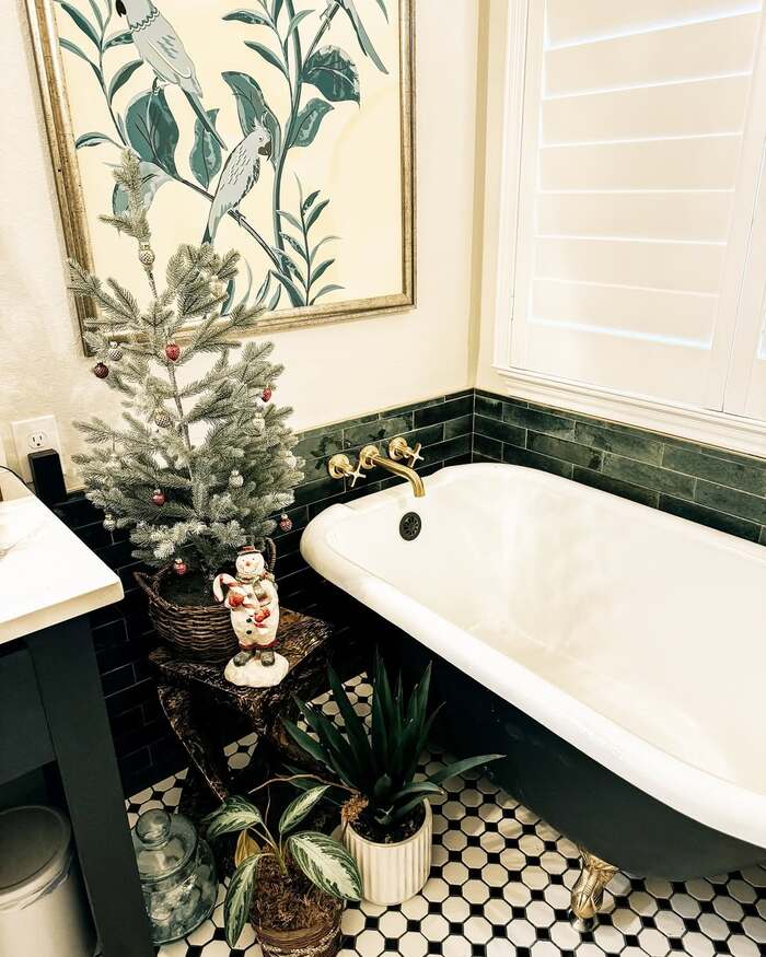 This one’s moody and I love it. Dark green tile wraps the tub and a vintage botanical print hangs above, so the small tree with red ornaments suddenly feels like it belongs to the room, not just December. A little snowman statuette adds a wink. Houseplants around the tub bring life and help soften the grid of the tile. If your space already has strong color, match your winter bathroom decor to it instead of fighting it.