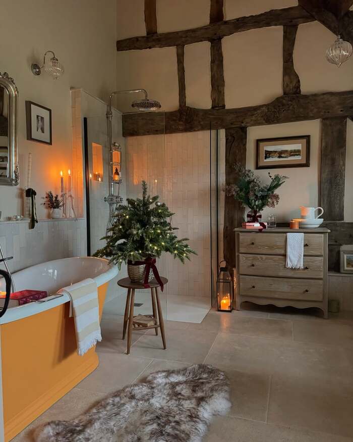 This rustic room hits me right in the feelings. The chunky wood beams make everything feel old-world cozy and that amber orange tub brings the glow. A petite Christmas tree on a stool is the hero, lit with tiny warm lights and tied with a dark ribbon. The lantern on the floor adds a soft flicker that kind of slows your breathing. I’m a sucker for textures, so the furry rug and the rough wood next to smooth tile is chef’s kiss. If you want bathroom christmas decor that feels natural, steal the stool tree idea and mix wood with wool.
