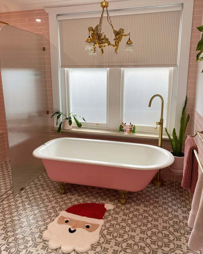 The pink clawfoot tub with brass feet is honestly a mood. It’s sweet but not sugary because the patterned floor tile and fluted glass give it structure. The Santa-face bath mat is cheeky, and I usually run from novelty rugs but here it totally works. If you want playful Christmas-themed bathroom style, add one bold holiday element on the floor and keep the rest clean. Two tiny figurines on the window ledge and a couple of plants keep it light and fun.