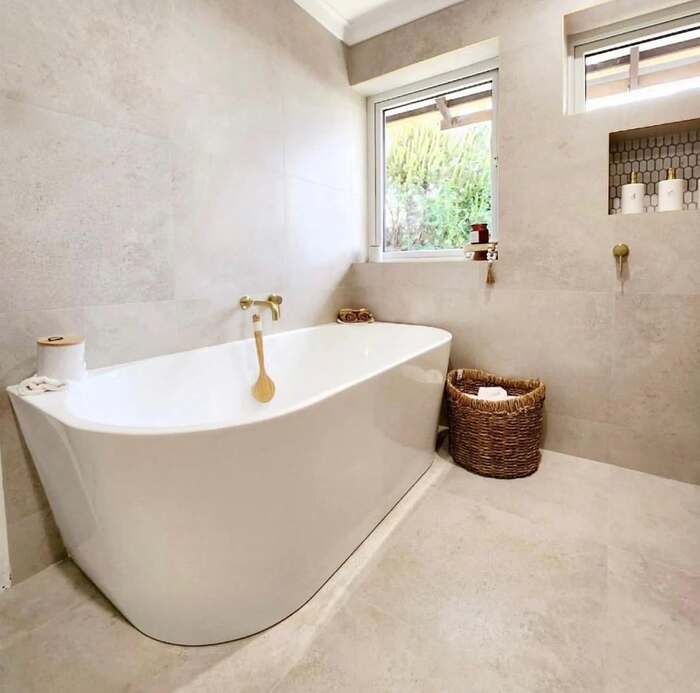 Warm beige tiles run wall to wall and right up the wall, too. The tone-on-tone effect makes the tub look sculptural. Brass taps and a simple woven basket add just enough décor.