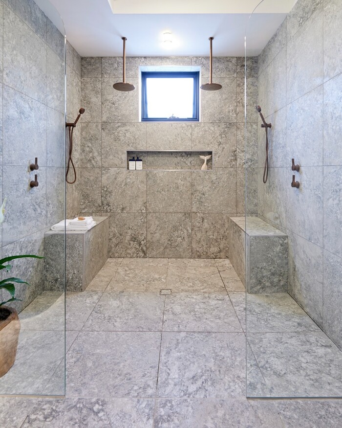 Because the layout is long, the repeating pattern leads your eyes to the walk-in shower. Use dark grout on the floor for easier cleaning.