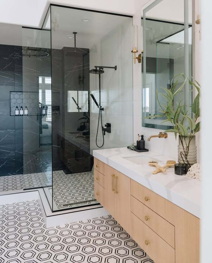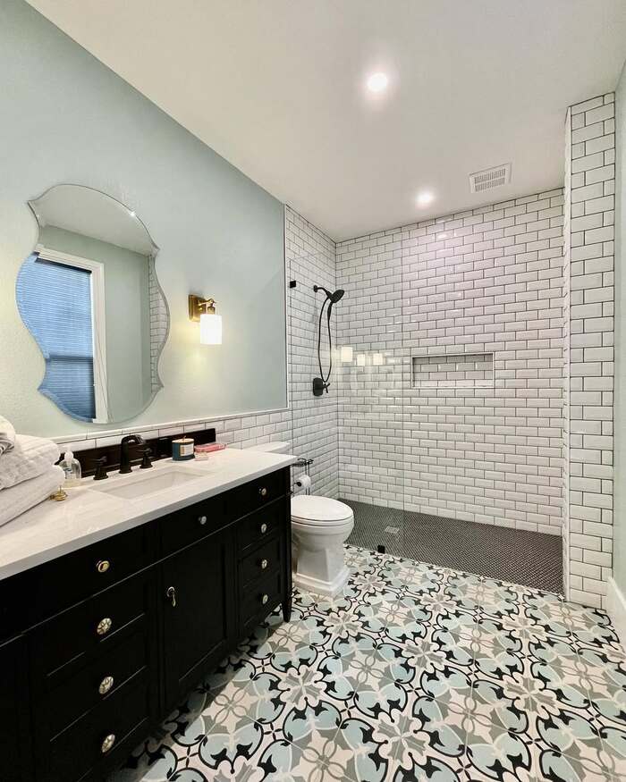 Tip: Keep the vanity simple so the floor pattern isn’t competing.