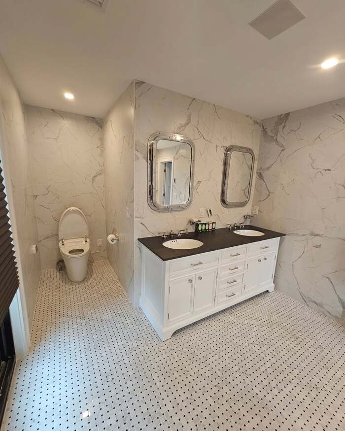 Big marble slabs on the walls and petite square mosaics on the floor, plus a double vanity. The small-scale floor adds grip and texture so the room doesn’t feel slippery.