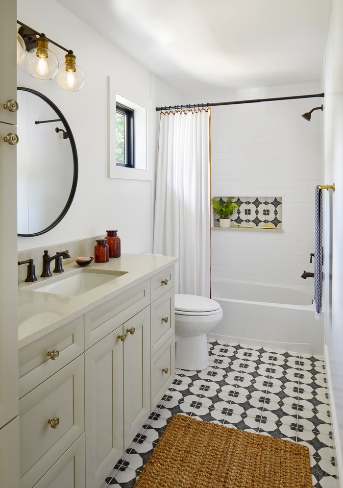 The patterned black-and-white ceramic looks playful with the warm jute runner. I love the little echo of the motif inside the shower niche.