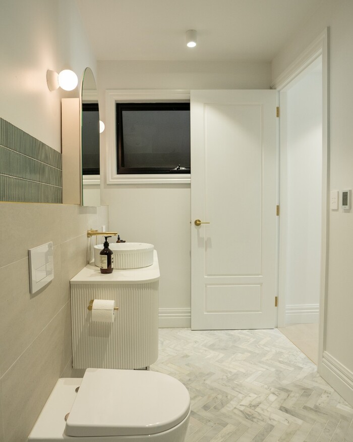 The long herringbone layout pulls your eye down the hall and makes the room feel taller. Soft white walls, round mirror, and ribbed vanity keep the focus low and calm.
