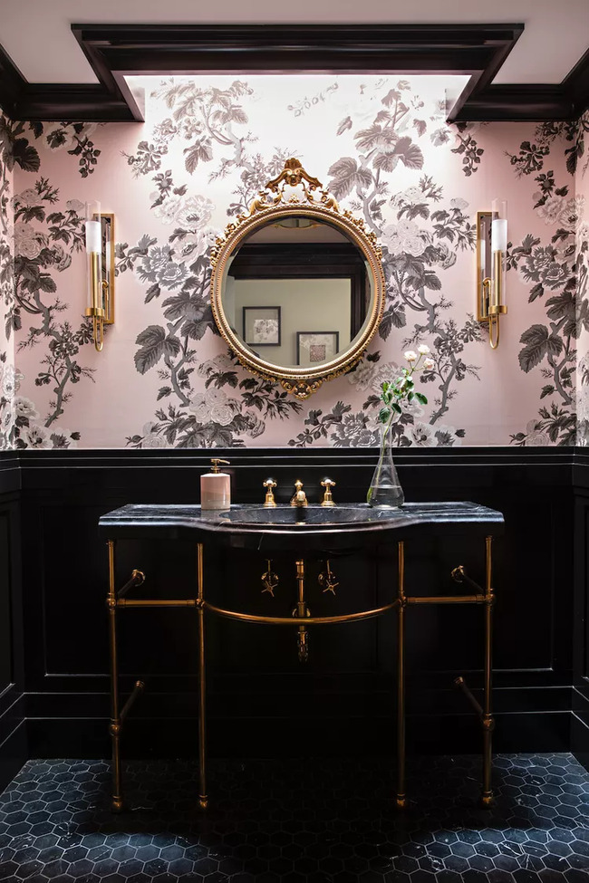 Inspired bathroom vanity ideas here include mixing delicate wallpaper with dark millwork. Fans of vintage vanity ideas will feel seen.