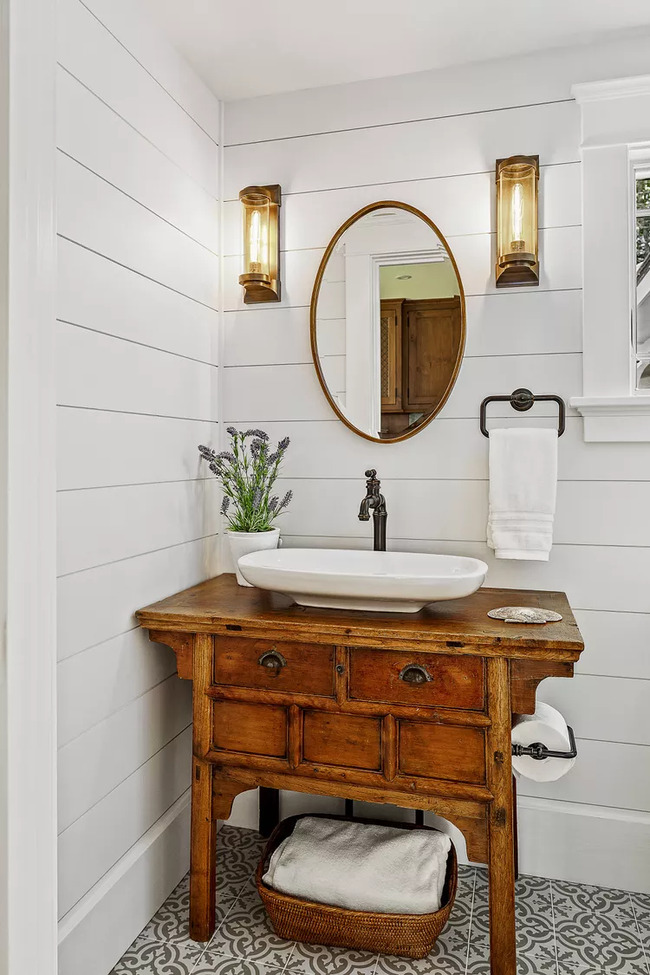 I’m weak for furniture used as a vanity. Style is cottage with real wood grain and little dings that tell stories. Lighting glows from two lantern sconces, friendly and warm. Colors are honey wood, creamy shiplap, patterned tile. Layout keeps leggy furniture so floor space shows. Décor is a basket for towels and a sprig of lavender.