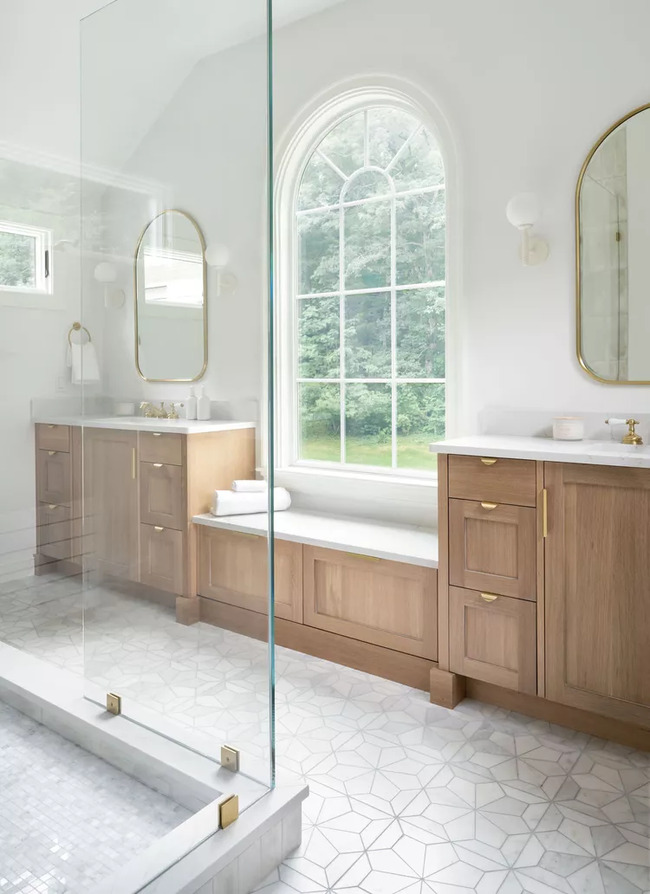 This room is a sigh. Style is airy traditional with twin vanities and an elegant bench under that arched window. Lighting is natural and generous, so makeup shades read true. Colors are pale oak, white stone, brushed brass. Layout is symmetrical, which calms the brain. Décor is gentle, just rolled towels and simple mirrors.