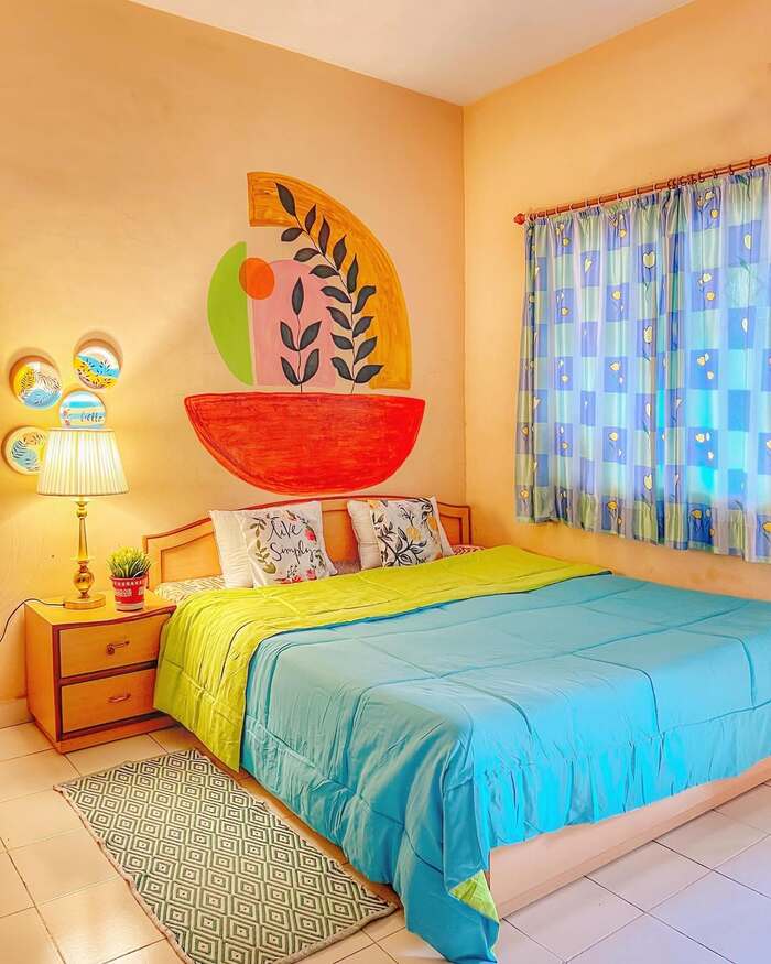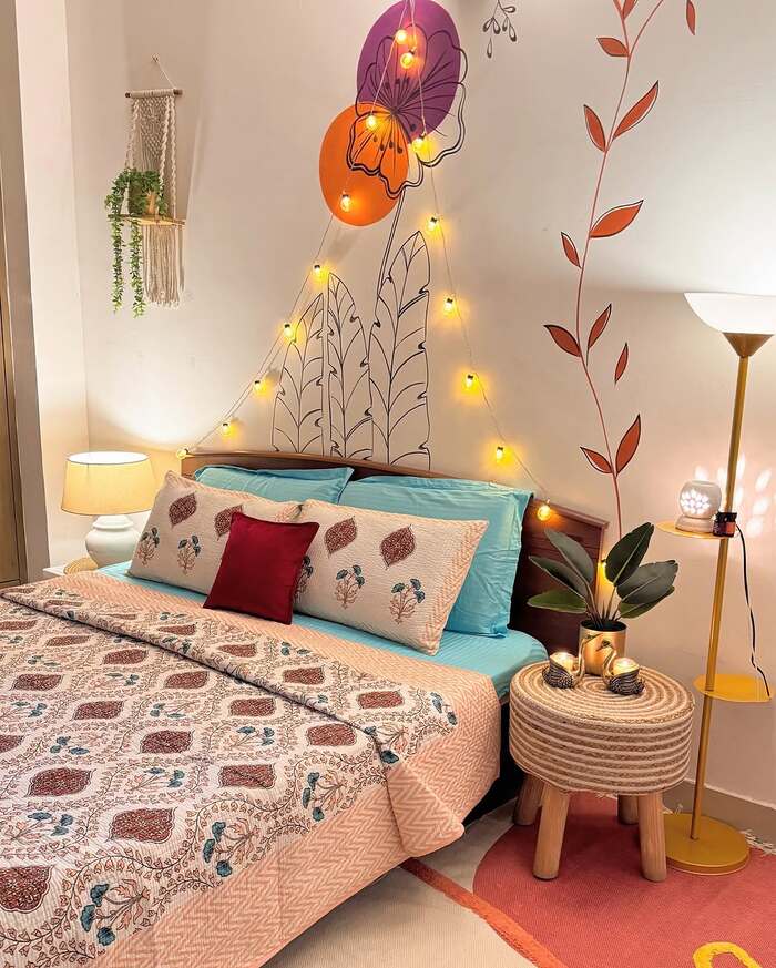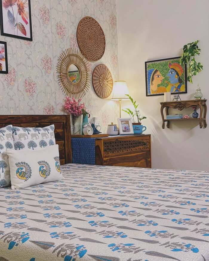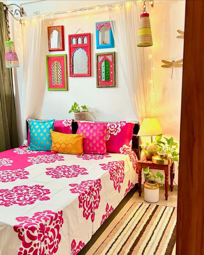 Here’s proof that ideas for bedroom wall decor can be playful. Those carved frames and tiny mirrors bring in India-inspired color without repainting. Keep the bed simple and let the artwork carry the energy.