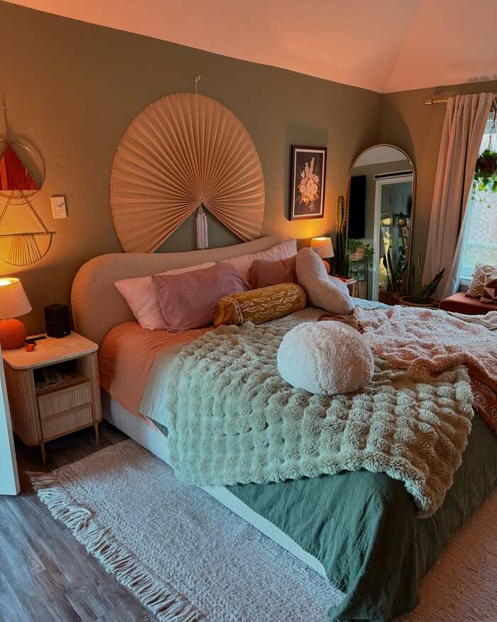 This space leans boho with the giant pleated fan as art. It’s smart and calm. When clients ask for bedroom wall décor ideas that feel grown-up, I steer them to one large object, not twenty small ones. The curved headboard and layered throws keep the look soft.