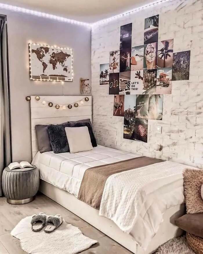 Add a skinny LED strip around the ceiling line, but keep it dim so it doesn’t scream dorm. For renters, this is top-tier small bedroom wall decor ideas on a budget.