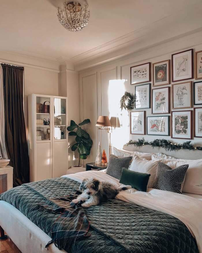 If gallery walls normally stress you out, start with nine pieces arranged on the floor. Then hang with painter’s tape guides. This is classic wall art ideas for bedroom that will outlast trends. Also, the puppy on the quilt gets a 10/10 from my design assistant, who is also my dog.