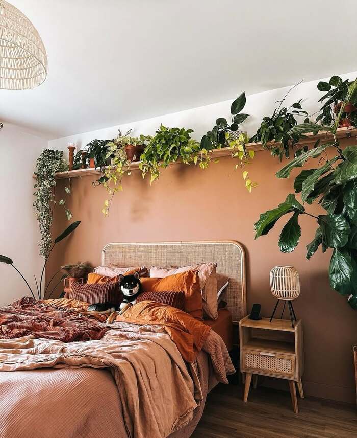 Another earthy beauty. The rattan headboard sits against a clay-colored wall that flatters green leaves. A long plant ledge runs the width of the bed, which visually widens the room. If you try this, stagger pot heights and make sure at least one trails.