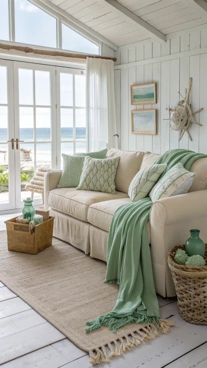 What stands out to me is how beautifully the gentle tones of the beige sofa ground this living room, while pops of green create an invigorating yet serene atmosphere. This aesthetic perfectly captures a coastal vibe, making it feel airy and welcoming.
