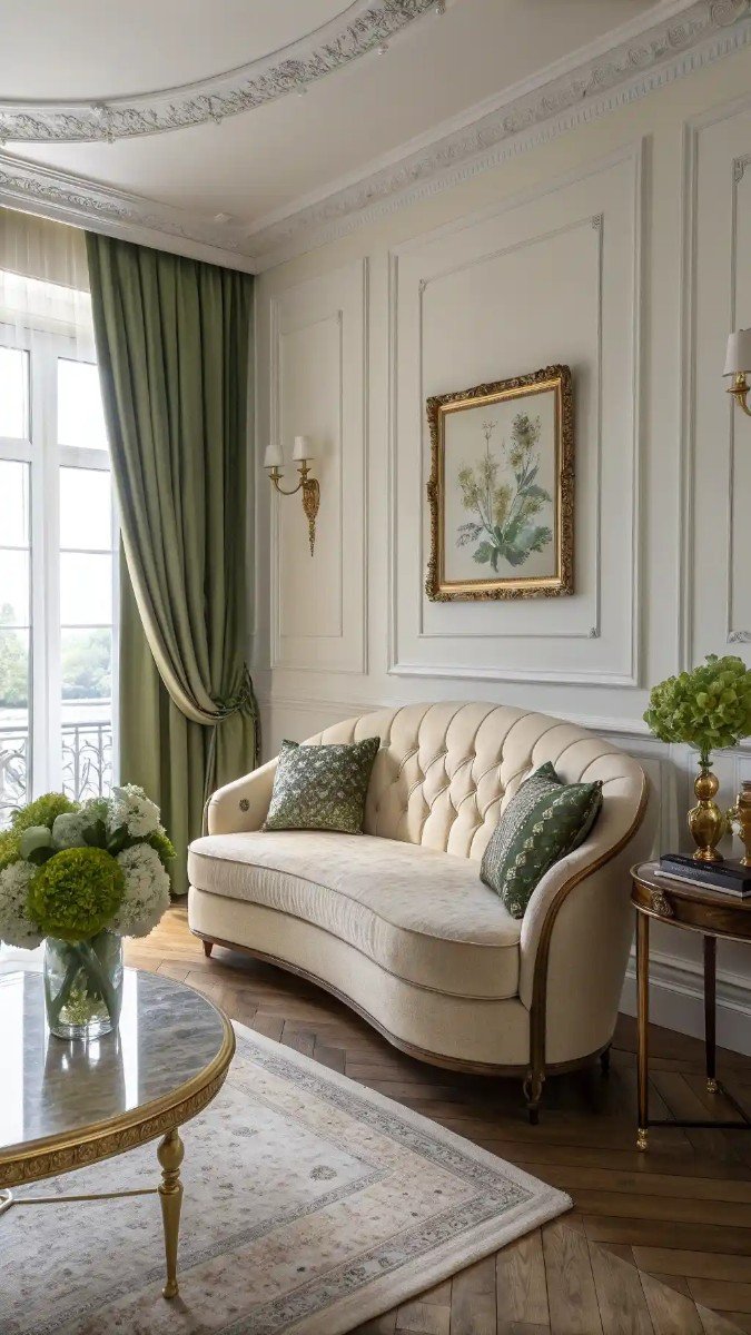 What I find compelling about this is the exquisite balance between classic design elements and a refreshing color palette. The choice to pair a beige sofa with varied shades of green creates a surprisingly sophisticated and serene atmosphere. It’s a thoughtful approach to design that feels both grand and inviting.